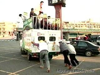 面对陈水扁与民进党的候选人都已经出发,载着随行记者的小货车却无法发动,上面的几个记者面面相觑,十分尴尬;竞选总部的几个工作人员只得帮忙推车,意外成为了这场辅选的焦点。(赵静)