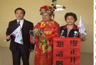 据台媒报道,由中国民党征召参选第七届“立法”委员选举的前桃园县副县长廖正井,17日在夫人杨启津及上百名乡亲陪同下,打扮成财神爷,手拿三脚蟾蜍,前来完成参选登记手续。廖正井表示,若当选后,就要做的就是,能带动青埔高铁站附近繁荣发展的公共设施,例如副县长任内所提的巨蛋棒球场及世贸展览馆的兴建。