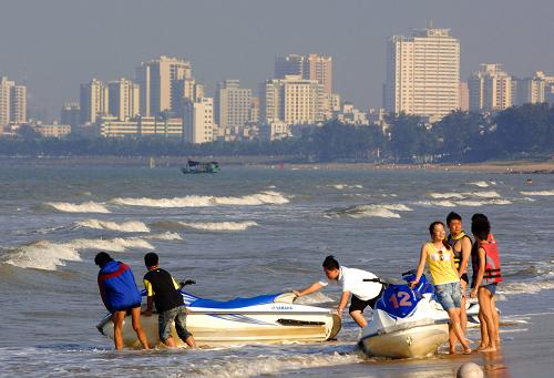 2009年10月6日,游客在海口市假日海滩游玩。海南2009年全年实现旅游收入206亿元,同比增长8.1%。新华社记者赵颖全摄