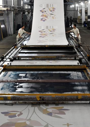 2009年9月14日,海南海宁经济发展总公司下属的椰海毛毯厂染色车间工人在给毛毯染色。该厂2009年1至8月加工生产的52个花色品种的50多万条毛毯全部出口到日本、以色列、西班牙等十几个国家和地区,克服了世界金融危机所带来的负面影响,经济效益较2008年同期有大幅提高。新华社记者赵颖全摄