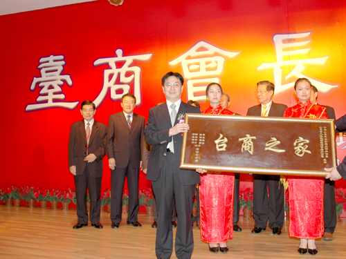 2006年8月30日,山东省台办主任杨庆文接受台商会长们赠送“台商之家”牌匾 |