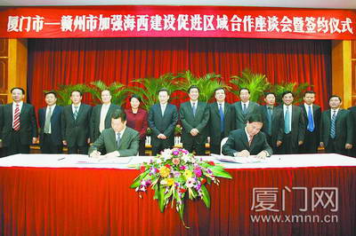 两市举行了加强海西建设促进区域合作座谈会,厦门市委副书记、市长刘赐贵和赣州市委副书记、市长蔡晓明分别介绍了两市的经济社会发展情况,福建省发改委副主任郑勇简要介绍“海西”战略的重要意义和主要内容。两市领导就加强海西建设,促进两地合作的有关问题进行了座谈交流,刘赐贵、蔡晓明代表两市签订了《关于加强“海西”建设,进一步推进区域合作的协议书》。