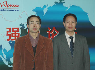2006年2月,中国社会科学院台湾研究所经济室主任孙升亮(右)、研究员王建民(左)接受人民网访问。(图片来源:人民网)