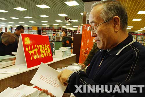 11月1日,一位读者在翻看十七大报告蒙古文单行本。当日,十七大报告蒙古文单行本在呼和浩特市内蒙古新华书店图书大厦与读者见面。新华社记者李睿摄