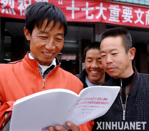 10月28日,几位市民在翻阅刚购买的十七大报告单行本。