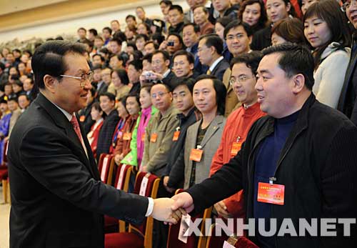 11月13日,全国青年作家创作会议在北京召开。中共中央政治局常委李长春出席会议并讲话。这是李长春接见出席会议的代表。 新华社记者李学仁摄