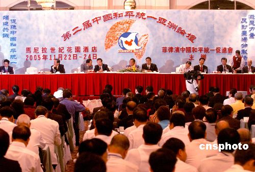 中新社马尼拉十一月二十四日电 (记者 余显伦 关向东)菲律宾中国和平统一促进会于十一月二十三、二十四日假菲律宾首都马尼拉主办了第二届“中国和平统一亚洲论坛”。论坛二十四日晚于马尼拉世纪花园酒店闭幕并发表题为“团结一切反独力量 推进中国和平统一”的宣言。