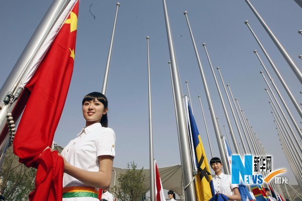 2010年4月30日上午八时三十分整,上海世博会中国馆前的世博旗林准时升旗。