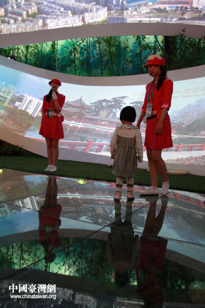 在湖南馆内,两位讲解员和一位小女孩的身形,以及银幕上投射的美景,倒映在玻璃地板上。(中国台湾网 钟宝华 摄)