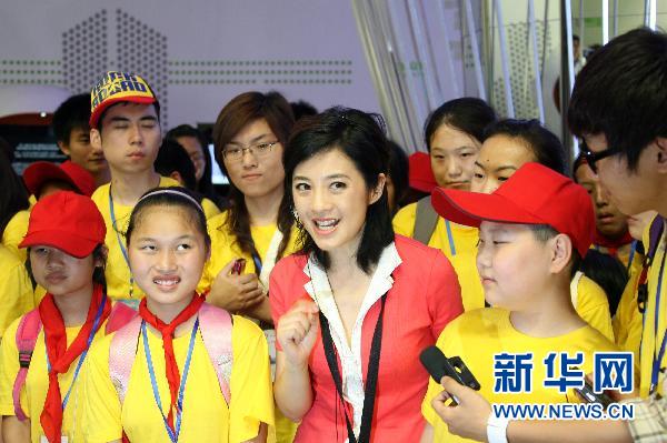 6月6日,著名主持人许戈辉(左三)和盲童一起参观上海世博园生命阳光馆。当日,来自湖北的30多名盲童和30多名志愿者组成的世博体验团来到了上海世博园。