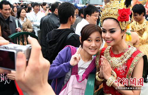 图为游客与泰国舞者合影留念。中新社发 汤彦俊 摄
