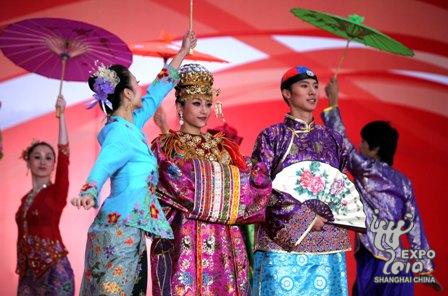 演员们表演新加坡当地各民族和谐相处的音乐舞蹈