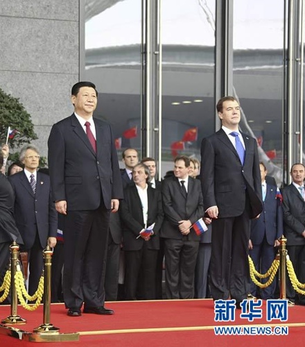 9月28日,国家副主席习近平和俄罗斯总统梅德韦杰夫参加在世博中心前举行的升旗仪式。当日,上海世博会迎来俄罗斯国家馆日,俄罗斯总统梅德韦杰夫出席馆日活动。