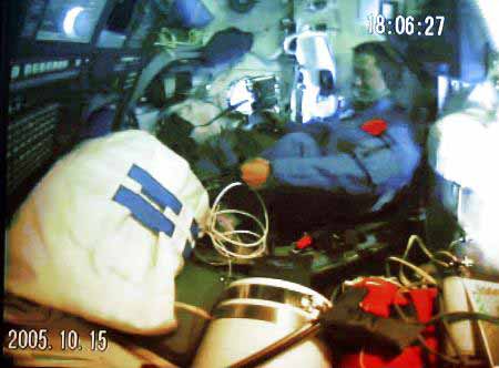 10月15日18时06分,航天员聂海胜在神舟六号飞船返回舱内向地面传回太空图像。[新华社照片]