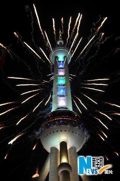 4月30日晚,东方明珠塔被灯光、焰火装扮得分外美丽。当晚,中国2010年上海世博会开幕式大型灯光喷泉焰火表演在上海举行。