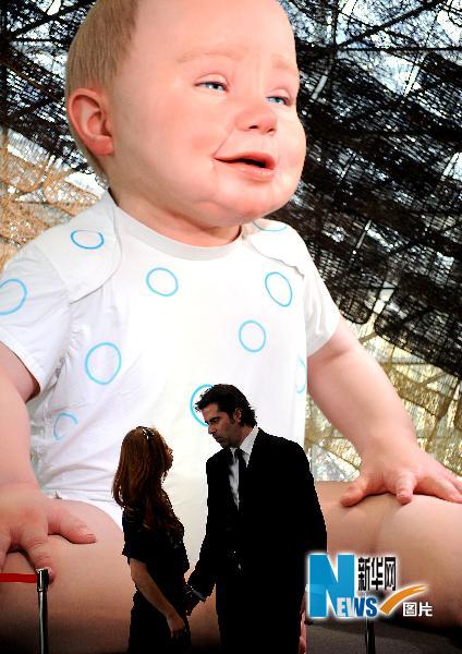 5月1日,在上海世博园西班牙馆,两名参观者在坐高6.5米的“西班牙国家馆的孩子”--吉祥物“米格林”前交谈。