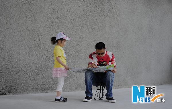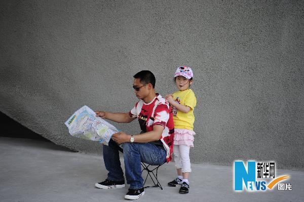 5月25日,在上海世博园瑞士馆外,一名小女孩帮爸爸拿着世博园区导游图。新华社记者 王芳 摄
