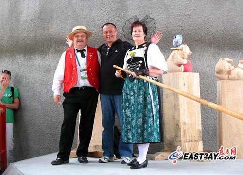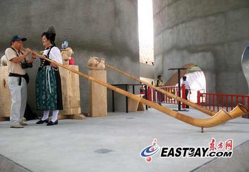 除了有轨缆车、屋顶花园和4层楼高的Imax影院,瑞士国家馆还特意为过路游客准备了许多有趣的节目。今天记者就在瑞士馆外的公共活动区发现两名身着传统服装的瑞士老艺人,他们正力邀许多围观游客上台试吹阿尔卑斯长号(Alphoin)——一种当地山区牧民的传统乐器。