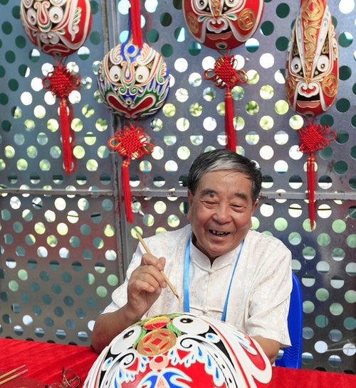 陕西活动周期间,10多名来自陕西的非物质文化遗产传承人在世博园内表演传统技艺。图为中国工艺美术大师李继友在展示他制作的社火脸谱。早报世博记者 王炬亮 图