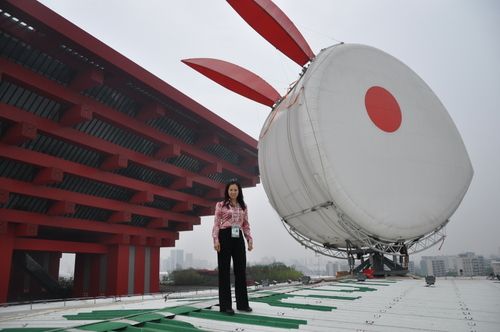 澳门馆的玉兔宫灯的兔头由充气飞艇的专用织物所造,兔头可根据风向转动,保持迎风姿态。