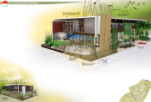 印尼政府代表、贸易部长Mari Elka Pangestu博士表示,整个印尼馆的建设预计将投入1000万-1200万美元,“展馆里有美丽的竹子,这是印尼传统与现代生活方式相结合的标志之一。”