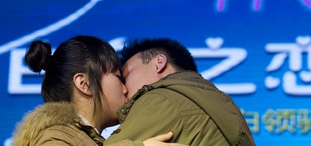 昨日,上海静安体育馆,一对男女在“白色情人节”相亲会上当众表白后拥吻。早报记者 鲁海涛 图