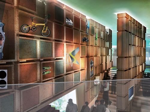 随后便是一个充满着创意的空间——“创新工厂”。这是一个光线暗淡、红光闪烁的大厅。在高至屋顶的大架上,陈列着众多来自德国的日常生活用品和与众不同的发明、设计作品。奇妙的是,“这间大厅中的一切都处于运动中”!传输带在人们的上空穿梭往来,满载着总共90多件展品,能看到LED灯、独特的带闹钟半导体、玩具拖拉机、自行车安全帽,以及有名的LikeaBike儿童学步车??工厂一角还有各种生产材料,你可以用手去触摸,挺有意思,让人能真正感而悟之。