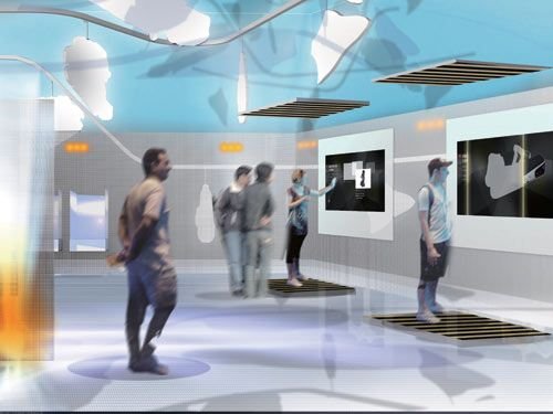 观众每二十人一组被请入展厅,穿过一个暗室,登上电动滚梯,之后穿行于一条隧道。顿时,“火车、汽车、公共汽车”交替出现,广播报站声,鸟儿啾啾鸣啭,水上荡舟的孩子们欢乐的笑声不绝于耳——当然,这只是一个用多媒体创意制作的美妙世界,指示着“你已进入德国城市”。