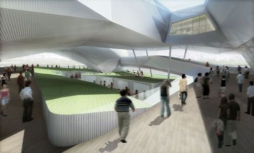 展示在我们眼前的是一个由透明的银色发光建筑膜包裹的建筑体,它漂浮于几根支撑结构上,怎么看,都像是一座可漫步其间的三维空间体雕塑。起落有致的坡型景区从底层向