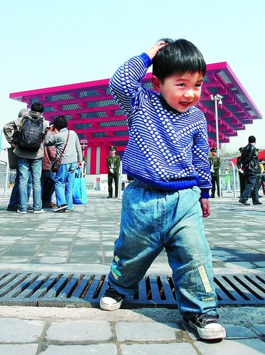 一个孩子在中国馆前玩耍。新华社发