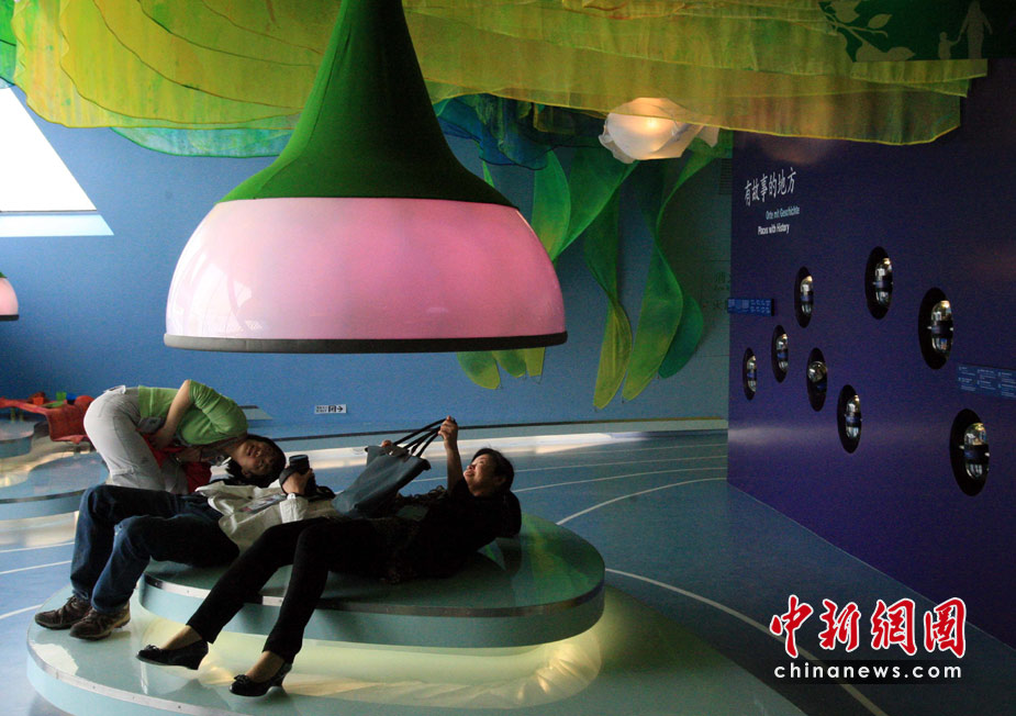 4月27日,三位年轻女记者在上海世博会德国馆内以各种独特的姿势探秘故事。当天,上海世博会组织者特邀注册媒体参观部分场馆。中新社发 潘索菲 摄
