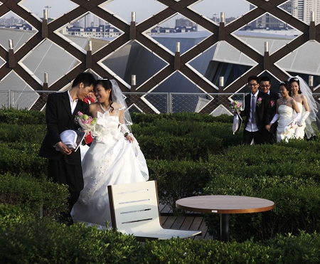 下午4点,盛大的婚礼仪式正式开始。杰曼市长为新人们一一颁发其亲笔签名的世博婚典证书。接下来,新人参观法国馆,并在法国馆江景园林餐厅——“第六感”餐厅,享用米其林星级大厨特为新人设计的全套法式浪漫大餐。据悉,婚礼新人的化妆、发型设计、摄像都来自法国。首届世博浪漫婚典后,婚礼主办方将继续接受报名。