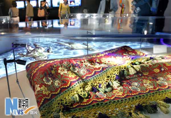 意大利馆内展示的手工印染的阿拉贡毛毯(5月15日摄)。当日,上海世博会意大利馆启动为期两周的“卡拉布里亚地区展”,展示这一地区的商业氛围、多元文化和悠久历史。卡拉布里亚是意大利南部的一个大区,面积15080平方公里,人口205万人。 新华社记者 刘颖 摄