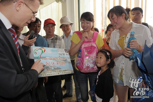 9日上午,来自上海的洪祎雯小朋友幸运地成为匈牙利馆的第100万名参观者。匈牙利馆副总代表李察德、副馆长瑟勒诗·凯特林一同代表匈牙利馆向洪祎雯赠送了匈牙利馆大礼包----一家三口免费到匈牙利首都布达佩斯旅游的机会。
