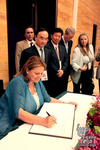 卢卡·卡策莉参观中国馆后,在签名簿上留言 摄影:赵立荣 朱弘强