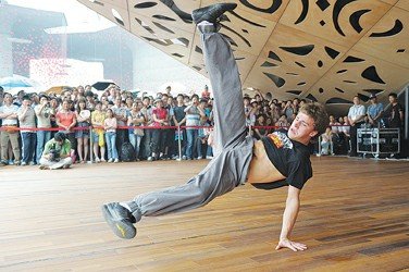 波兰最火嘻哈乐队TopToys的优秀青年舞者正在波兰馆前表演精彩街舞。