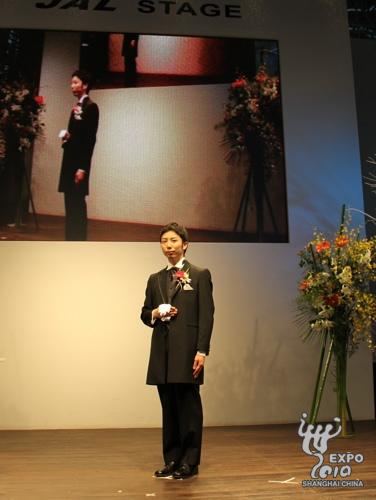 日本产业馆JAL舞台上,来自横滨的新郎冈阳介身穿西式礼服首先登场。之后,同样来自横滨的新娘冈美绪身着正红色、由3层衣服组成的日本传统服饰――和服,脚踩木屐,在父亲的引领下出现在观众面前。在两位新人宣读誓言、喝下交杯酒后,一位现场观众被邀请上台作为证婚人之一,和新娘父母、主持人、歌手小松拓也一起在结婚证明书上签字,见证两人的结合。随后,新人互换戒指,新郎向新娘送上深情一吻,至此,两位新人正式结为夫妇,而现场观众也在此时送上了阵阵掌声和祝福。
