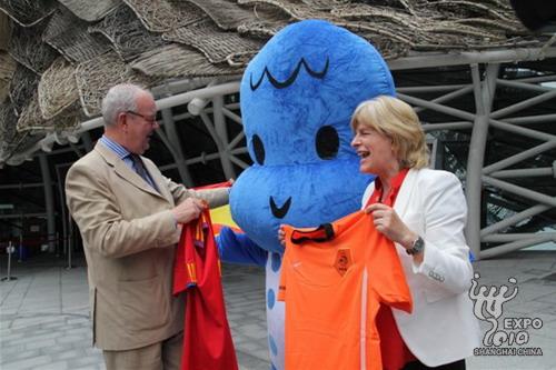 在西班牙馆吉祥物“小米宝宝”的陪伴下,西班牙馆总代表玛丽亚·蒂娜女士今天在馆内欢迎“快乐街”荷兰馆总代表沃特先生的到来。两位总代表昨晚都熬夜观看了比赛,此刻脸上还有一丝倦意,但他们都为自己国家的球队能够进入决赛而高兴。“最棒的那支队一定会赢!”沃特先生表示,而玛丽亚·蒂娜则真诚地回应道:“能与荷兰队在决赛中相逢,我们感到很荣幸。”