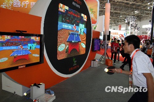 5月20日,一款名为“爱动·客厅里的网络健身馆”在北京开幕的2010(第26届)中国国际体育用品博览会上精彩亮相,吸引观众纷纷参与体验。图为一位男士现场体验网络健身馆的乒乓球比赛项目。 中新社发 孙自法 摄