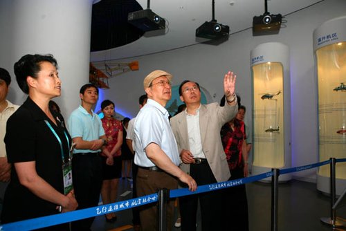 6月16日,徐匡迪院士(右二)在周俊馆长(右一)陪同下参观中国航空馆