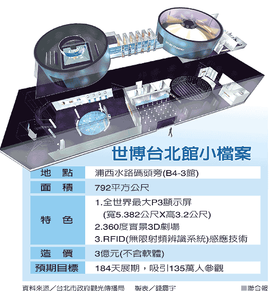 中新网3月31日电 据台湾《联合报》报道,上海世博会已进入倒数阶段,备受注目的台北馆的主题是“3D、互动、新科技”。参观者将乘坐升降电梯,模拟101高速电梯,透过实景360度3D剧场欣赏台北景点,还可透过RFID(无限射频辨识系统)隔空与台北景点合照,展现科技的神奇力量。