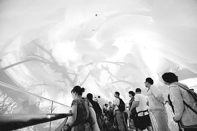 展区内的3D影院,不仅是一个影院,还是一部电梯。它非常特别,是模拟台北101大楼的观光电梯设计的。游客乘坐这部电梯,到101大楼的观景台去感受台北。随着电梯疾速“上升”,首先让人感觉到整个台北市就在你的“脚下”。短短的36秒,观众将到达“509米的高空”,宛如精灵的台北市鸟蓝鹊翱翔在清晨的淡水河上空,“36秒”拉开了这个城市一天的序幕:从繁忙的菜场,到台北风格迥异的街头艺人,再到晚间热闹的士林夜市,一切都井然有序地进行着。一张张不同的笑脸,都好像诠释着同一个概念:城市,让生活更美好。