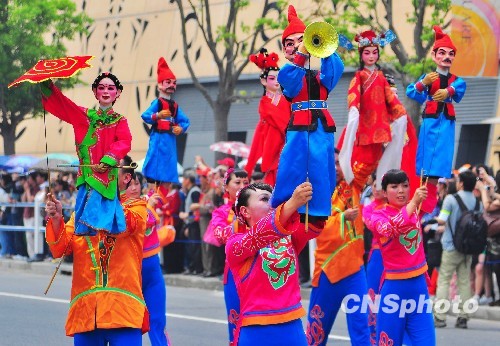 5月19日,上海世博会山西活动周开幕。其中,盛装巡游集中展示了太原锣鼓、孝义木偶“娶亲”、吉县“壶口唢呐风情”、翼城花鼓、清徐背棍等山西民俗艺术。中新社发 沈春琛 摄
