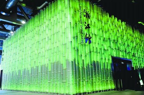 浙江馆的外观设计为竹立方。杨奇瑞表示,之所以选择竹,是因为浙江人对竹有着一种根深蒂固的偏好。“展馆面积不大,我们只能用一种象征和意象的手法来表现。而竹子就很好地体现出了浙江挺拔的气质和风度。”