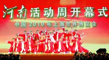 7月13日上午10时,在开封盘鼓、少林功夫威武雄壮的表演中,上海世博会河南活动周正式拉开帷幕。在接下来的5天时间里,来自河南的表演团队将在世博园宝钢大舞台上为国内外游客奉献一场场带有中原地域文化特色、展示黄河儿女时代精神风貌的大型户外广场演出。 (本版图片除标注外均为本报记者李建峰摄)