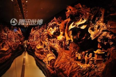 地下藏宝室的另一亮点,是这里展出的18米长,12吨重,2.56米高的巨型根雕《清明上河图》,近800个不同仪表、不同举止、不同神情的人物被刻画得栩栩如生。讲解员说,根雕原料是从东南亚进口的一整棵香樟古木,有2300年的树龄,“35位艺术家和工匠用了5年时间创作而成,北京一家评估公司认为它的价值大约为5.6亿元。”