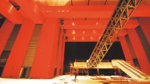 昨晚,上海世博会中国国家馆内部亮灯后,底楼被映得一片通红。中国馆是上海世博会的永久性建筑之一,目前,中国馆已经进入全面布展阶段,将于今年年底建成竣工。