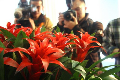 从上海鲜花港运来的大批花卉,让签约现场变成了花的海洋。其中最引人注目的莫过于有如火焰般绚烂的“中国红”。世博期间,将有共计2万盆“中国红”装点中国馆。上海鲜花港副总经理郭红华称,这种名为“中国红”的凤梨花卉经过两年研究培育而成,较之其他品种,色泽更为鲜艳纯正,花型饱满,花期长达半年,而且喜阴喜湿,易于栽培,是比较理想的室内用花。中国馆内的“中国红”将两月一换,以保持最佳的盛开状态。