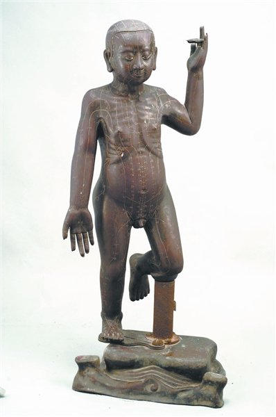 明代针灸铜人像从中医角度阐释人体穴位经络,全身遍布几百个密密麻麻的腧穴和经络,并在铜人像上一一标明位置,此件国宝从未展览过。