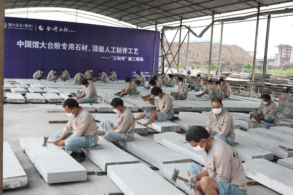 “三斩斧”,就是用斧头斩石,分初斩、细斩、终斩三道工序。大台阶每一级的宽度为72米,总面积达4700平方米。按每一斧的斧刃为5公分计算,为打造这个大台阶,石匠们至少斩了5400万斧,总长度就有2700公里,约等于上海到拉萨的直线距离。在安装中,也引进了世界一流的技术,使拼接效果达到天衣无缝。仿佛成了一张中国的名片,它宣扬着一种古老与现代完美结合的工艺技术结合。对于捐造大台阶的上海博大企业集团金博石材来说,也成了企业对外的一张金名片。